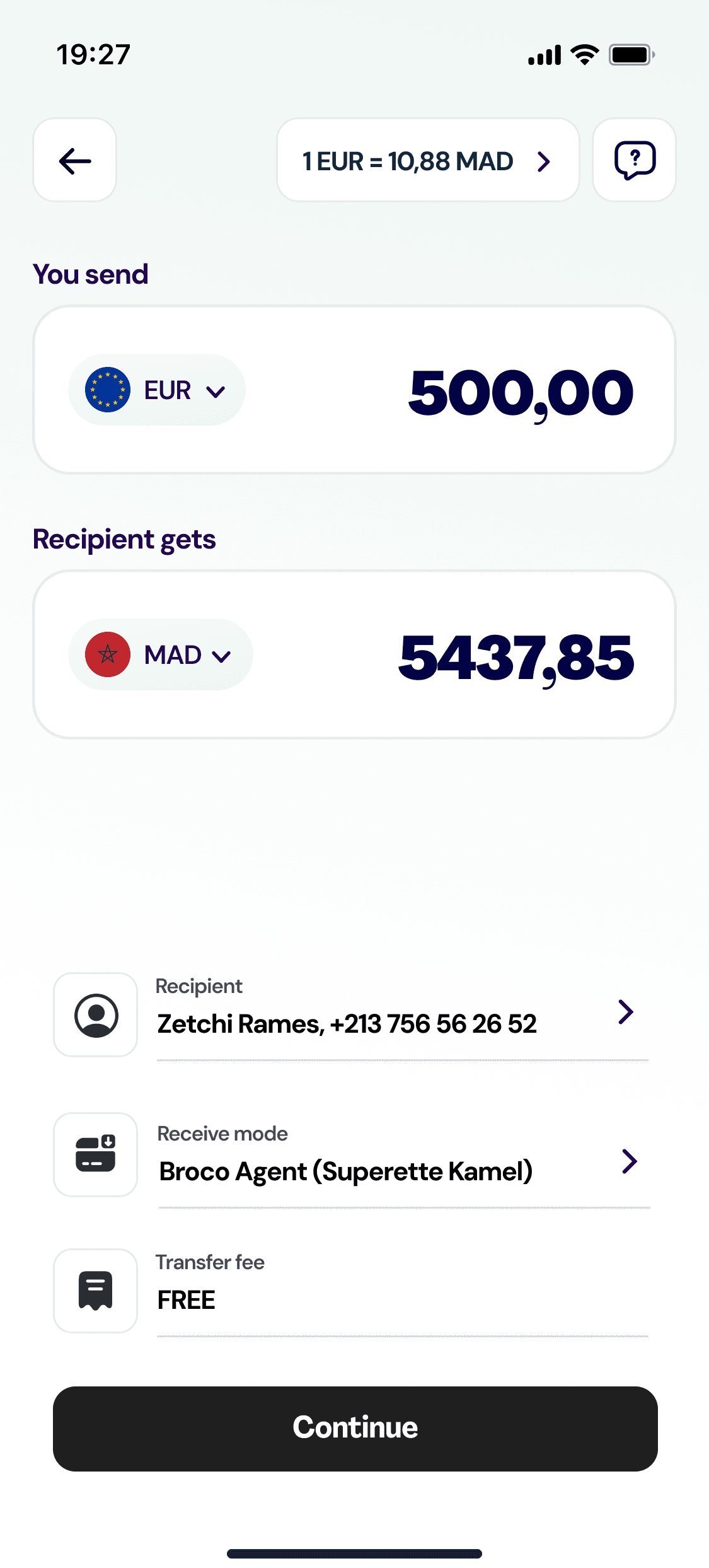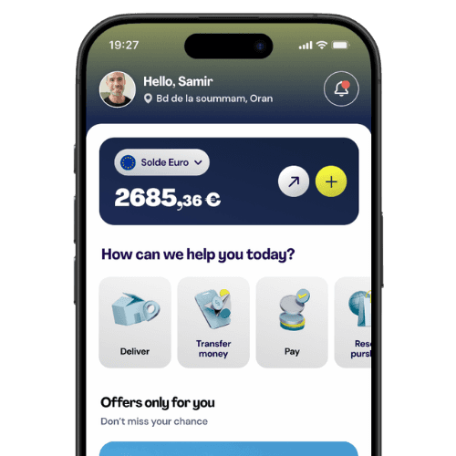 Transfer EUR to MAD, TND, XOF, or DZD — directly from your account. Your family receives at home, at an agent, or on their wallet. Transparent rates, low fees, no hidden markup.