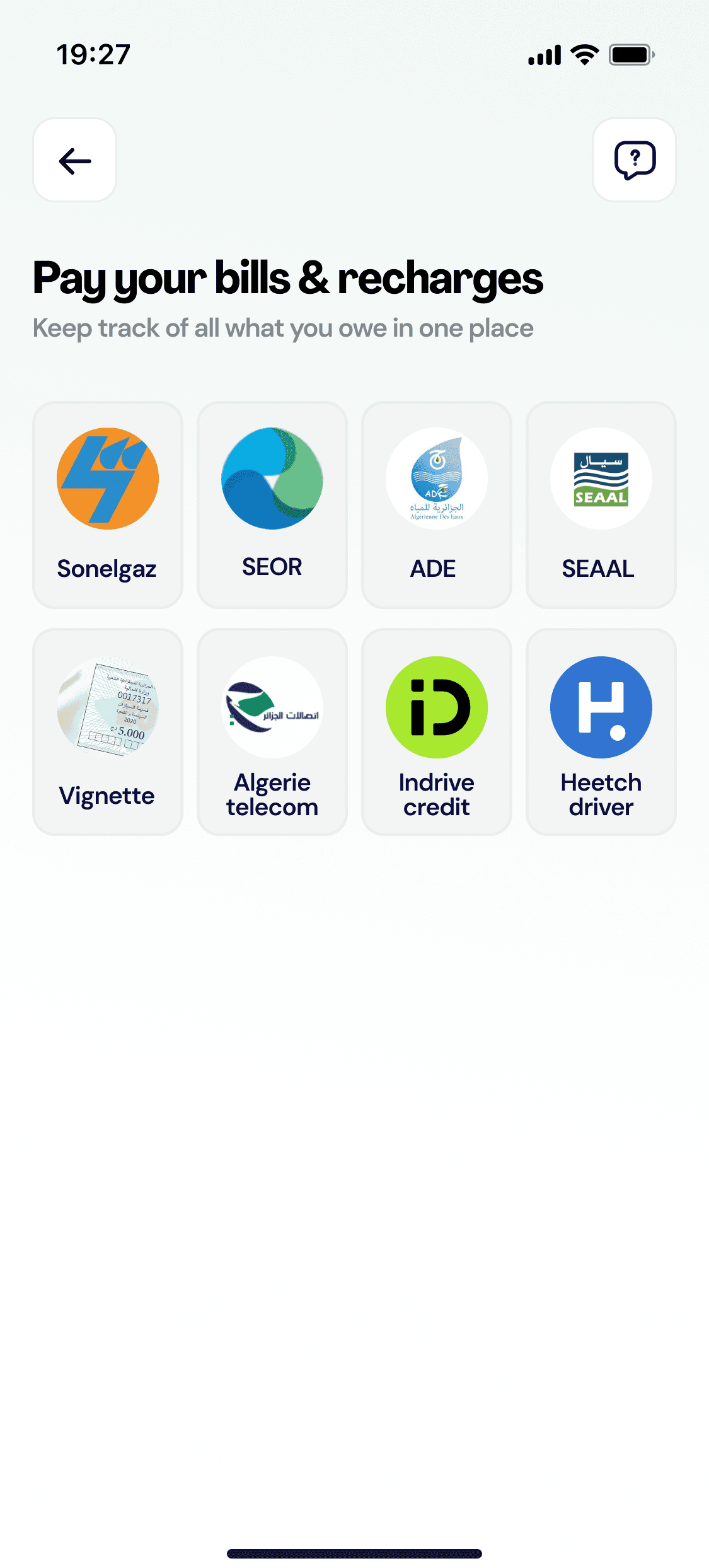 Electricity, Gas & Water. Pay your Sonelgaz, Seaal or ADE bill from the app. No queuing at the post office on the first of the month.