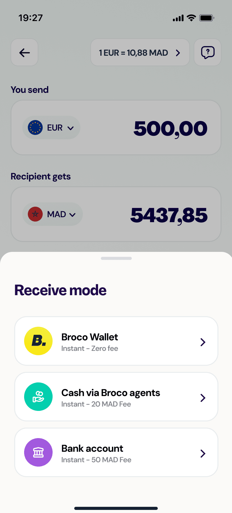 Bank account, mobile money, cash at an agent, or Broco wallet — your family picks how they receive. Available across Morocco, Tunisia, Senegal, and more. No lines, no delays.